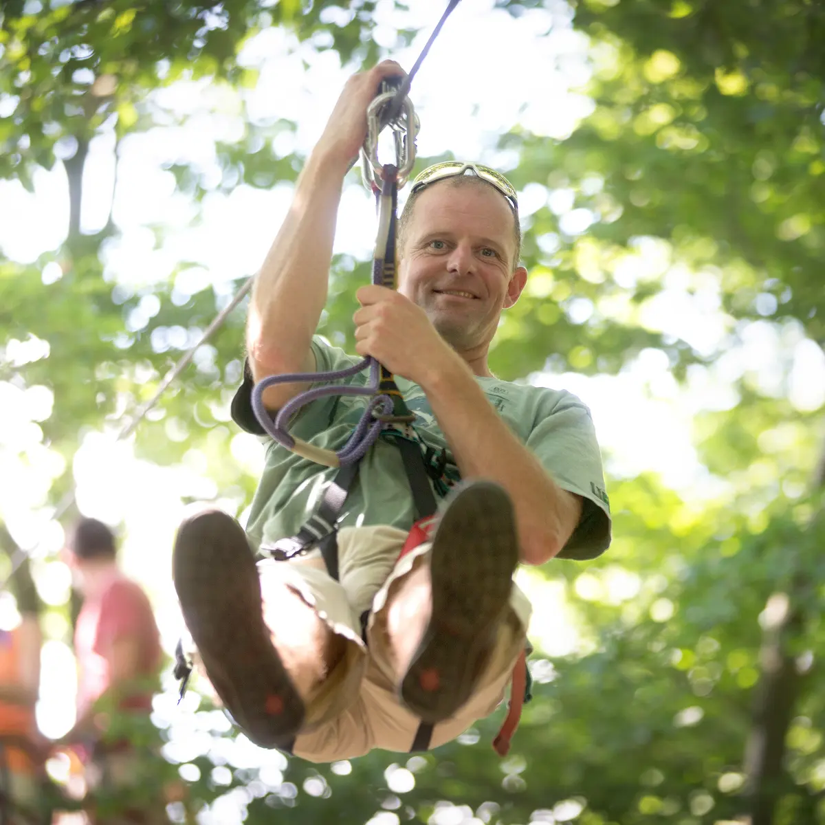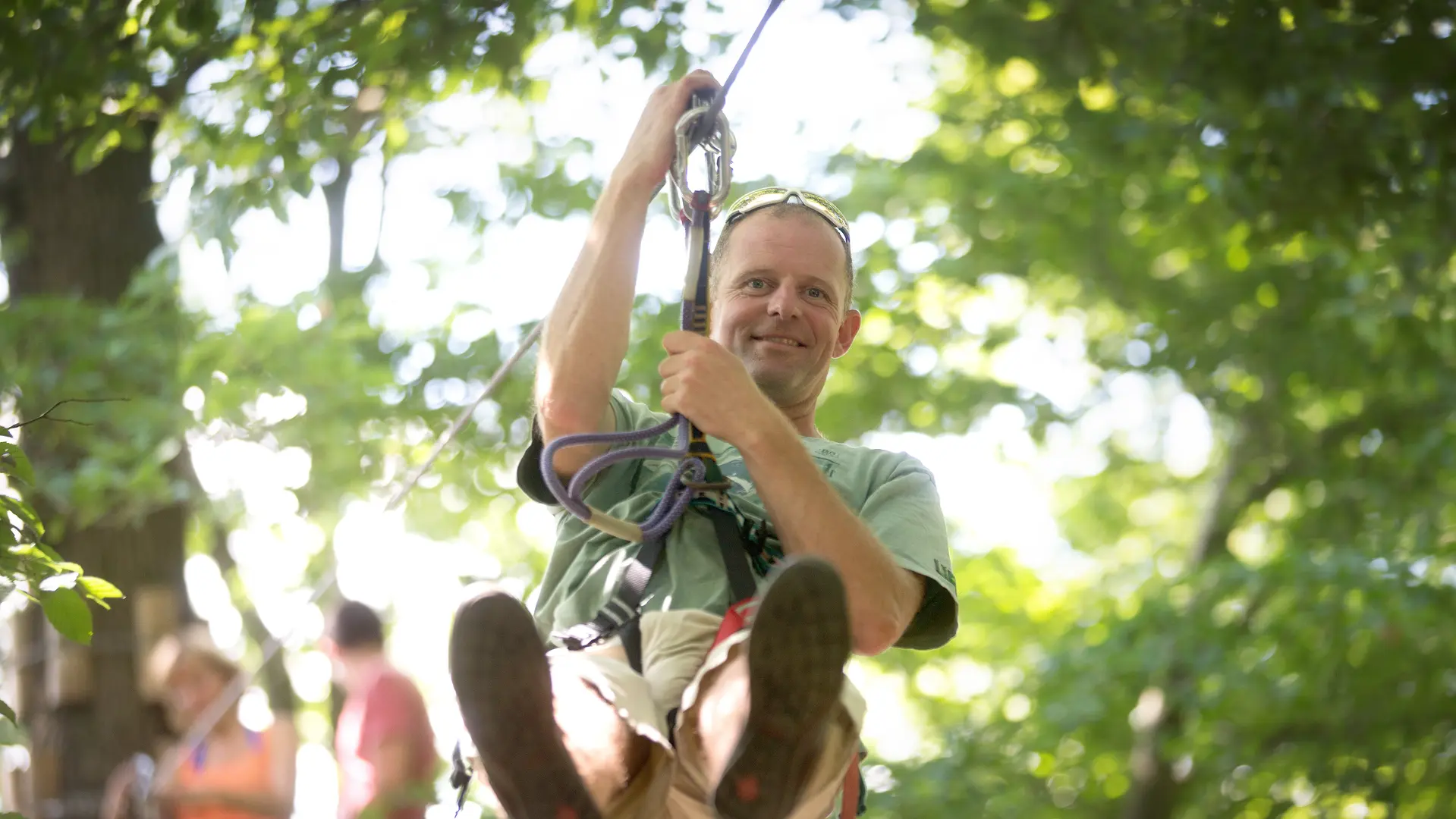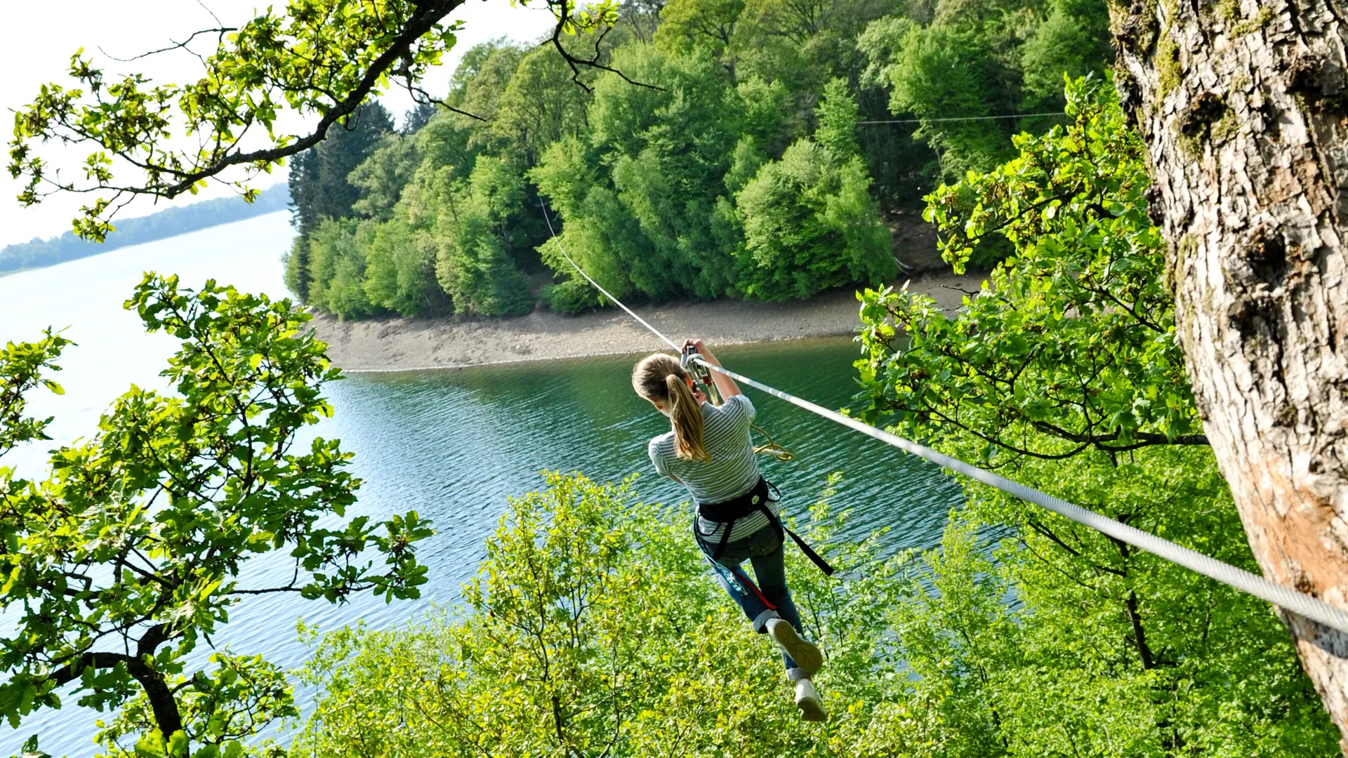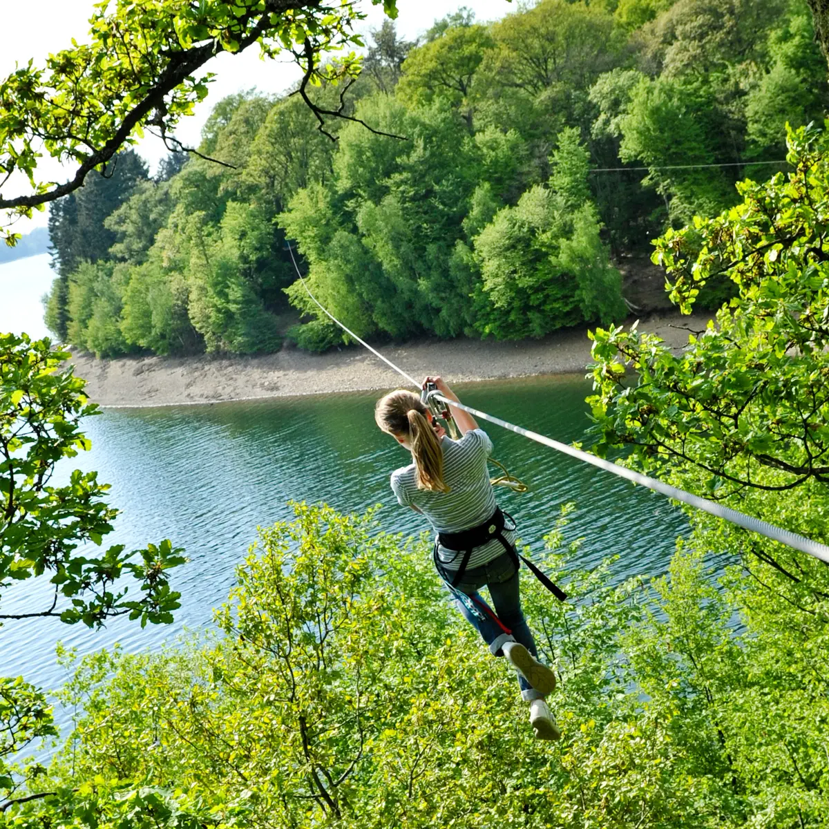 La double tyrolienne au-dessus du lac vous réserve un souvenir incroyable de votre passage au Natura Parc, assurément une sensation de liberté et de plénitude totale lors de ce vol d’une rive à l’autre.