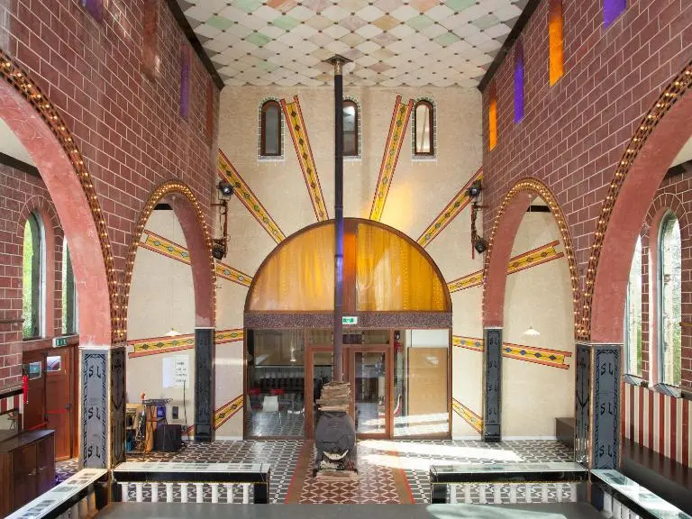 La « Chapelle de Verre », anciennement chapelle Sainte-Lutgarde, fut construite au début du 20ème siècle, période de plein essor pour le hameau de Fauquez qui connut là sa période de gloire grâce à la découverte géniale d’Arthur Brancart : la marbrite. La marbrite est un verre opacifié au maximum décliné en de nombreuses couleurs qui imite le marbre et qui fut utilisé intensivement dans le style Art Déco.