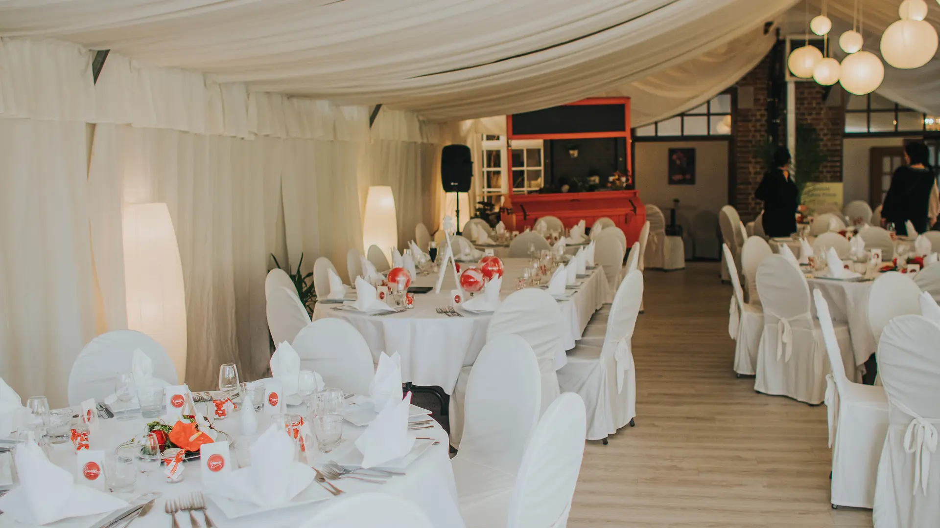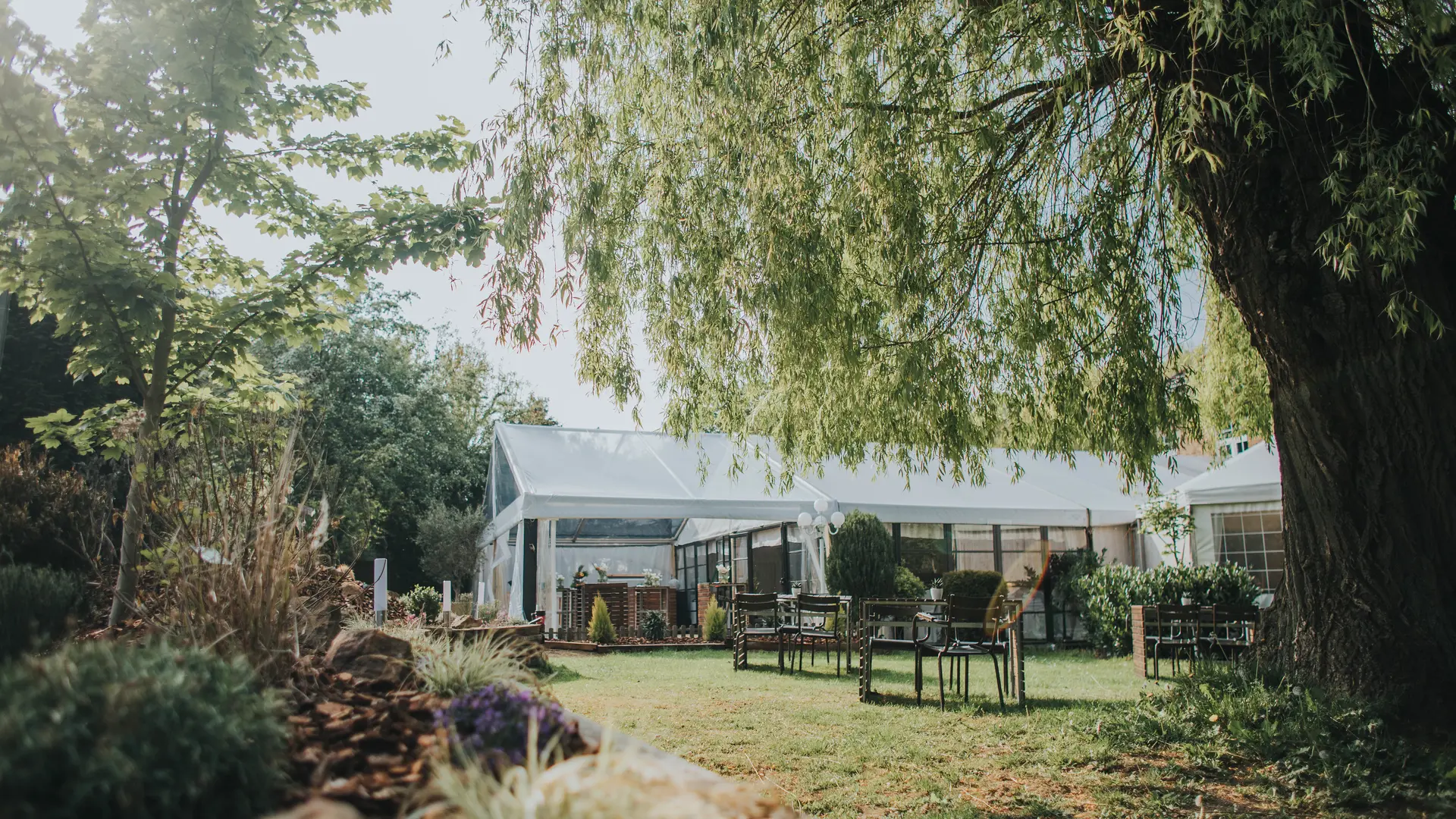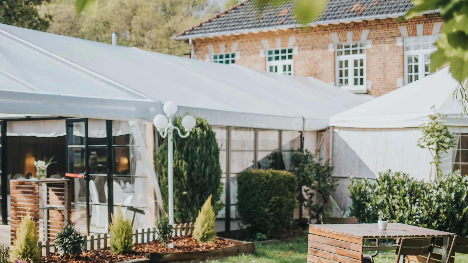 Derrière cette Maison de maître centenaire, vous découvrirez la salle de réception sous un chapiteau blanc niché dans un parc arboré et sa nouvelle terrasse couverte au milieu de ce cadre verdoyant, qui peut accueillir des groupes jusqu'à 150 personnes en place assise, 300 places en réception (debout) ainsi qu’un parking privé d’une capacité de +/- 30 places.