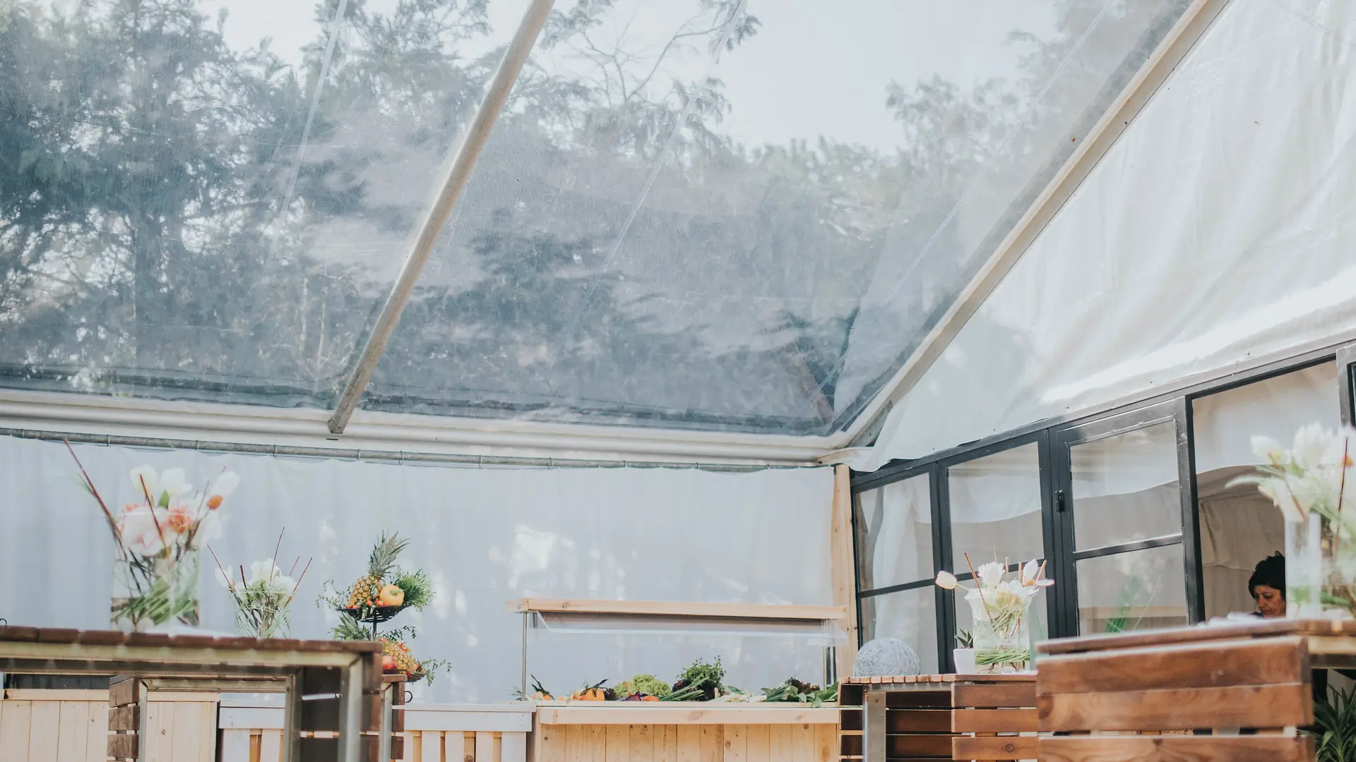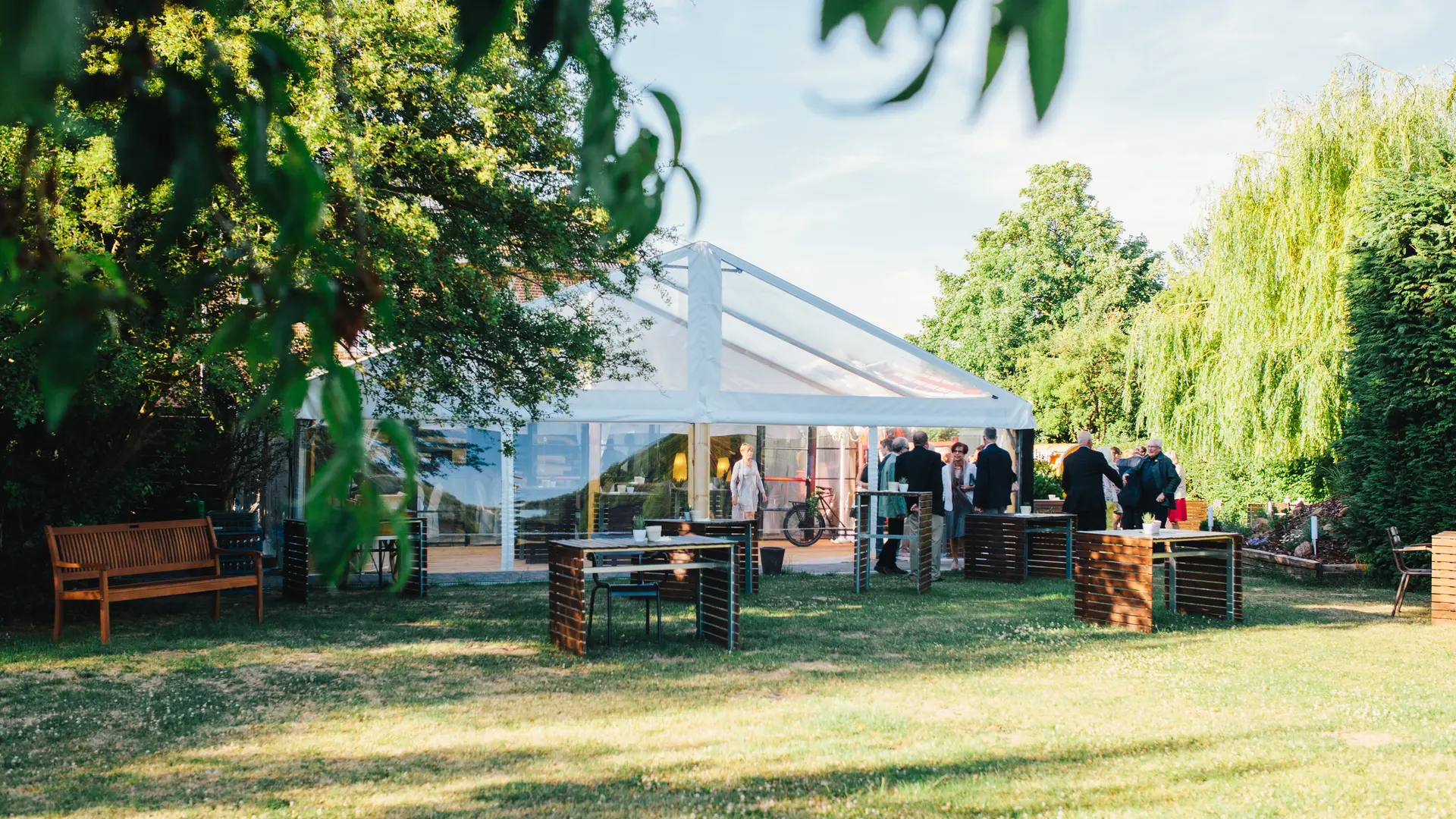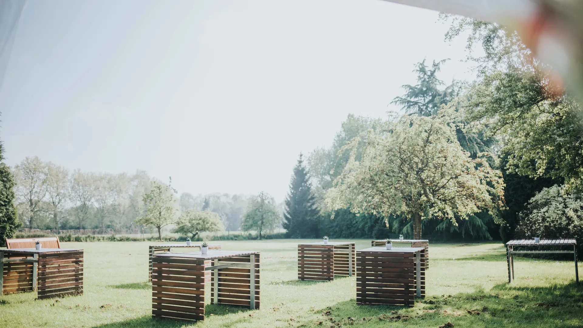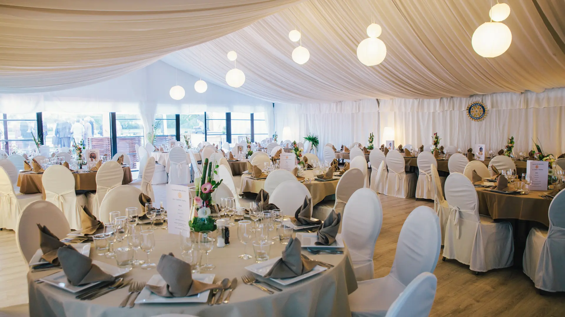 Derrière cette Maison de maître centenaire, vous découvrirez la salle de réception sous un chapiteau blanc niché dans un parc arboré et sa nouvelle terrasse couverte au milieu de ce cadre verdoyant, qui peut accueillir des groupes jusqu'à 150 personnes en place assise, 300 places en réception (debout) ainsi qu’un parking privé d’une capacité de +/- 30 places.
