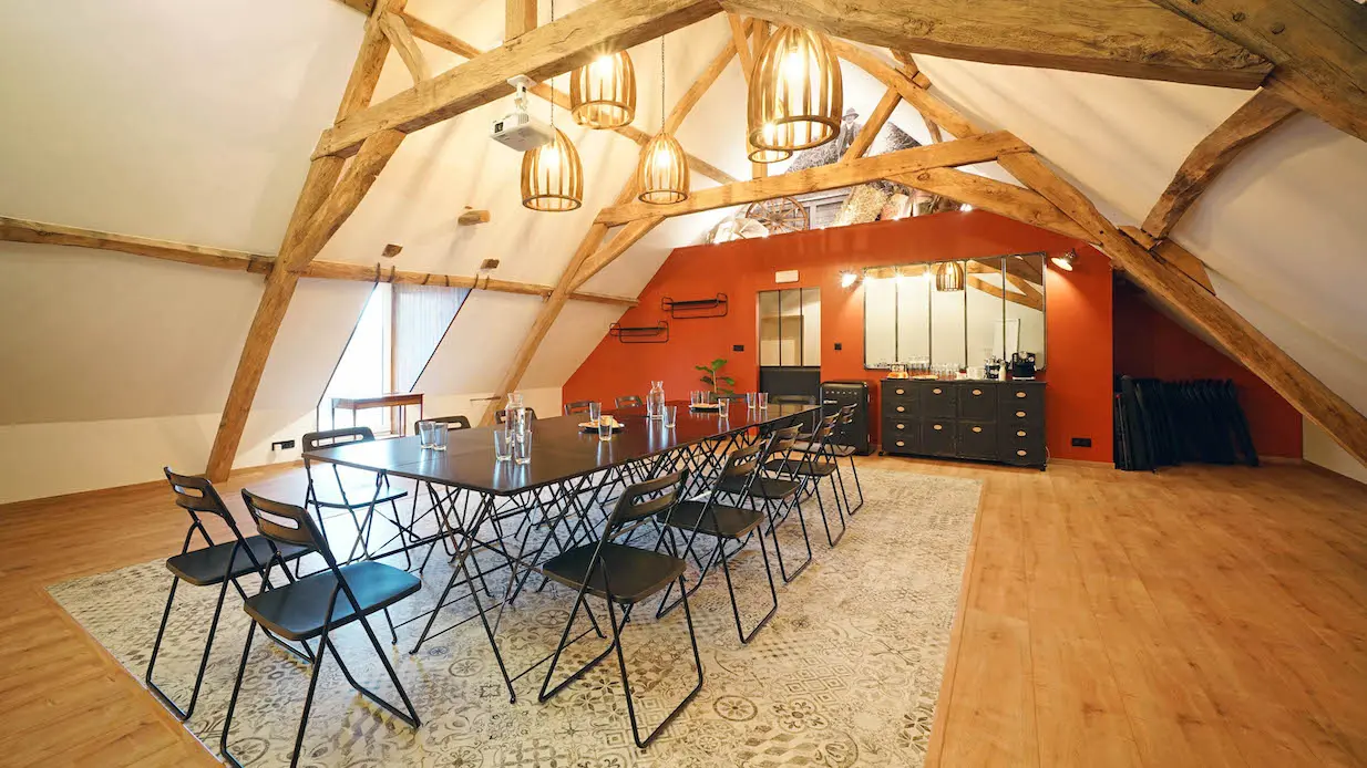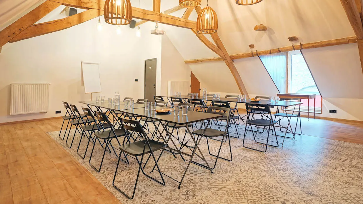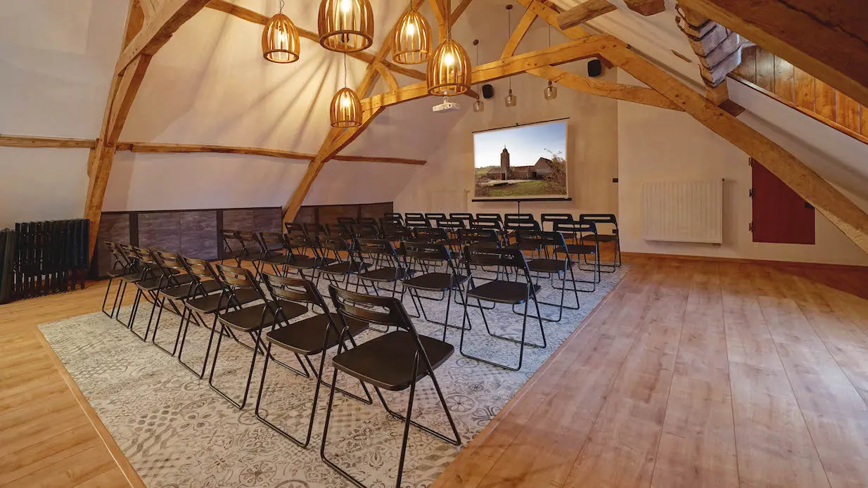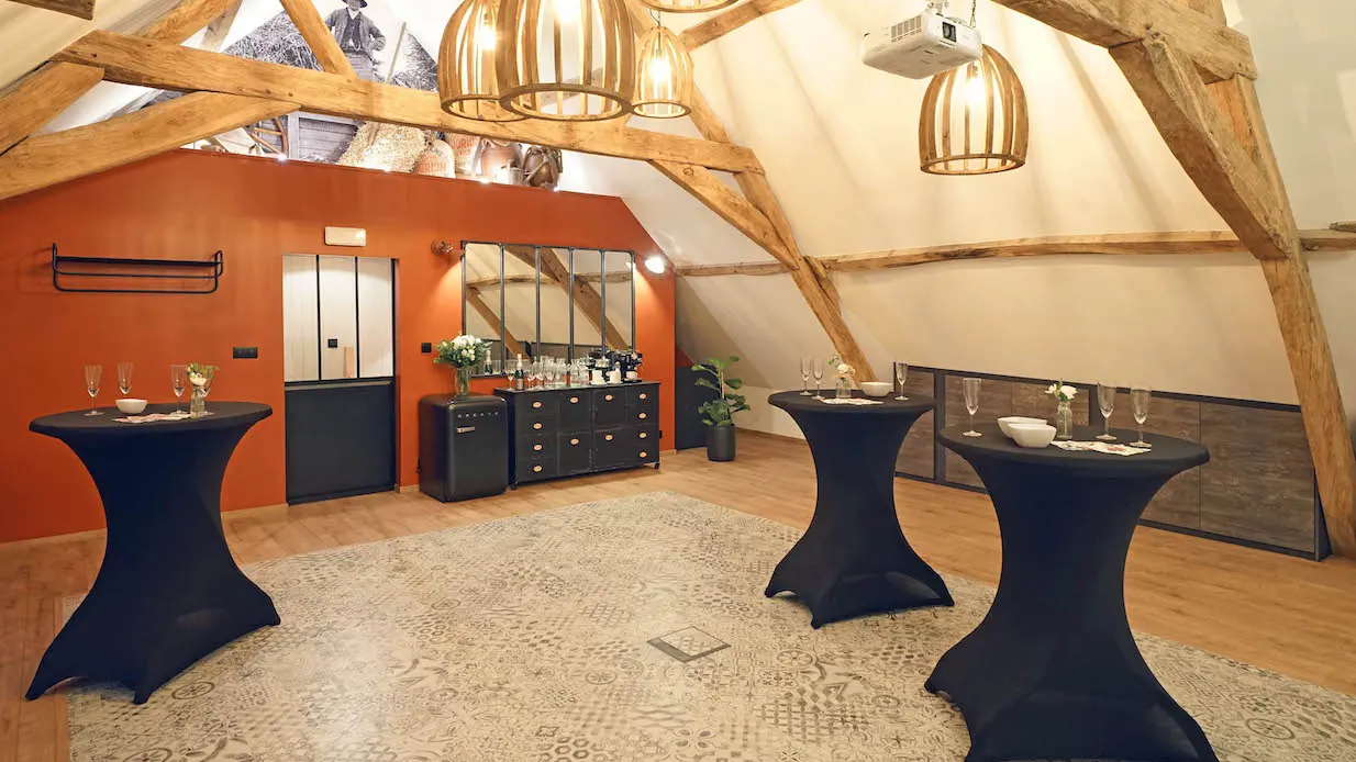 Cette salle modulable (90 m²), située à « La Ferme du Parc », un bâtiment de plus de 300 ans et une ferme familiale toujours en activité, se prête à de nombreuses activités privées et professionnelles.