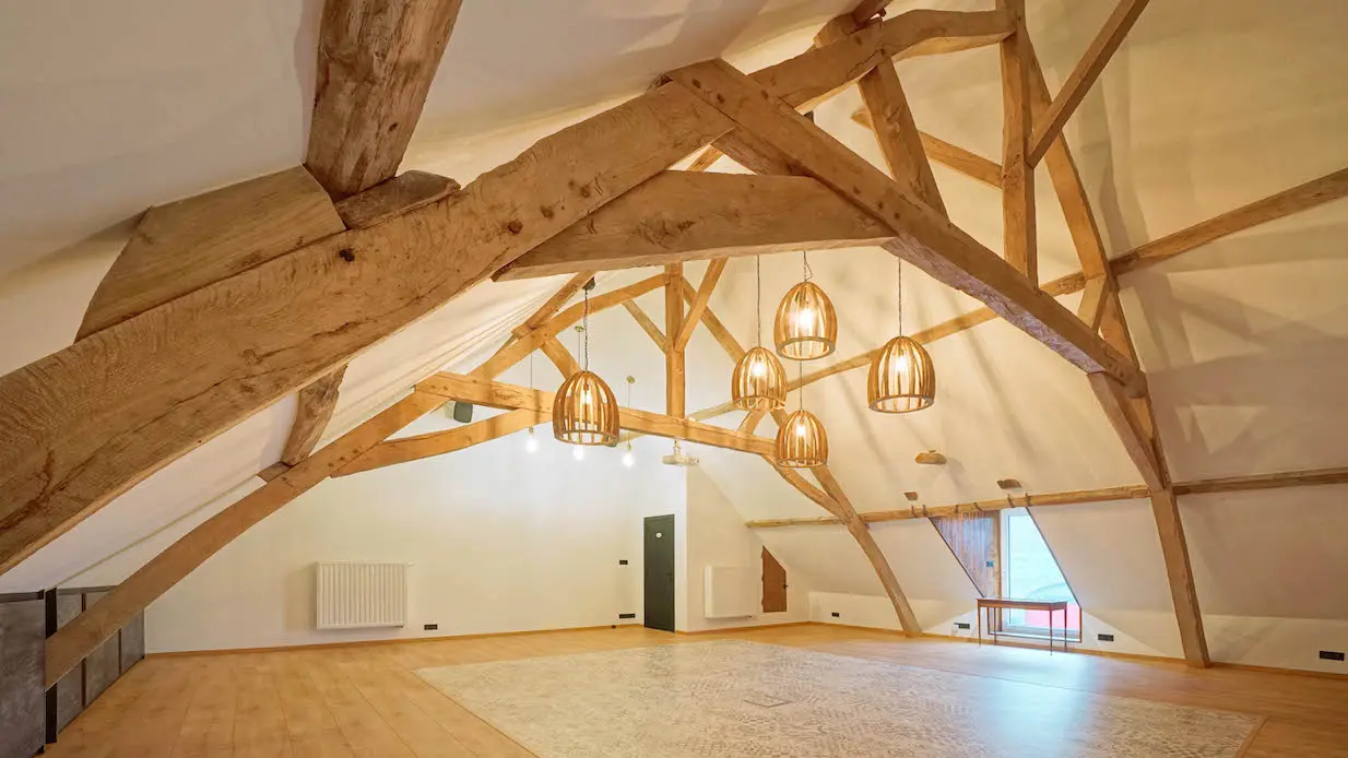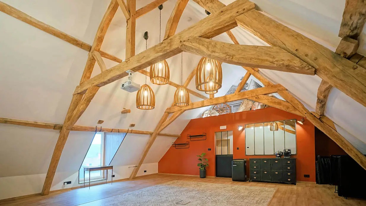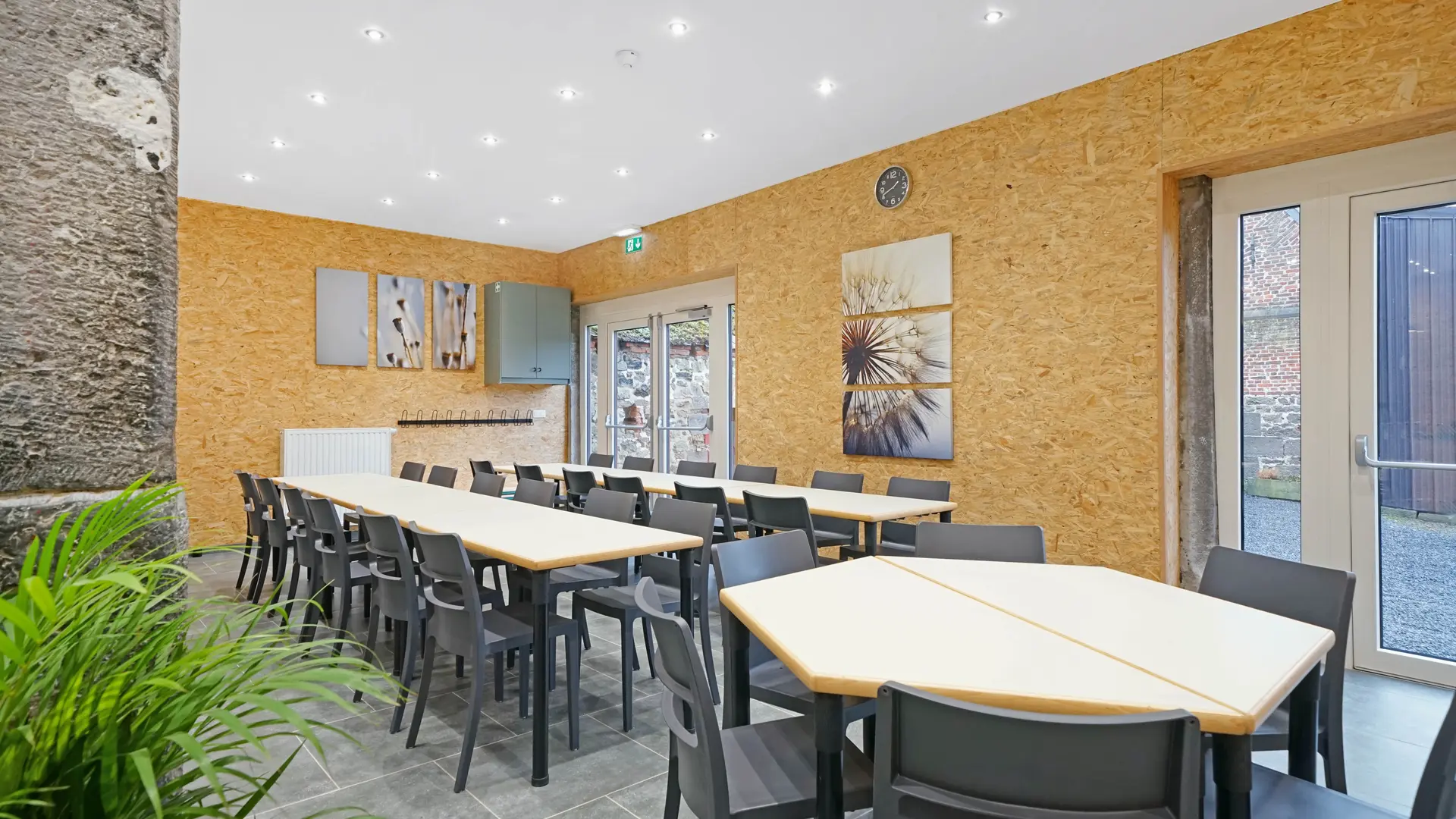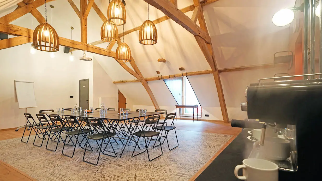 Cette salle modulable (90 m²), située à « La Ferme du Parc », un bâtiment de plus de 300 ans et une ferme familiale toujours en activité, se prête à de nombreuses activités privées et professionnelles.